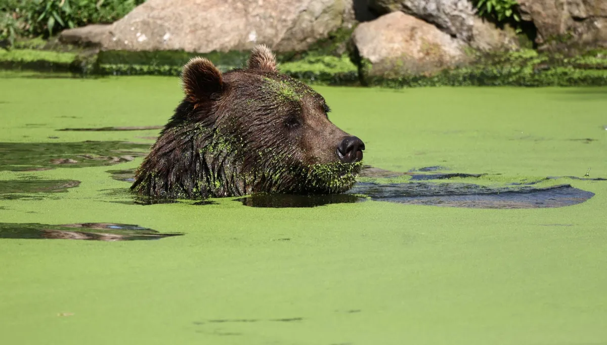 A bear cools down in a pond during the ongoing heatwave at the zoo in Berlin, Germany, August 14, 2025. REUTERS/Liesa Johannssen