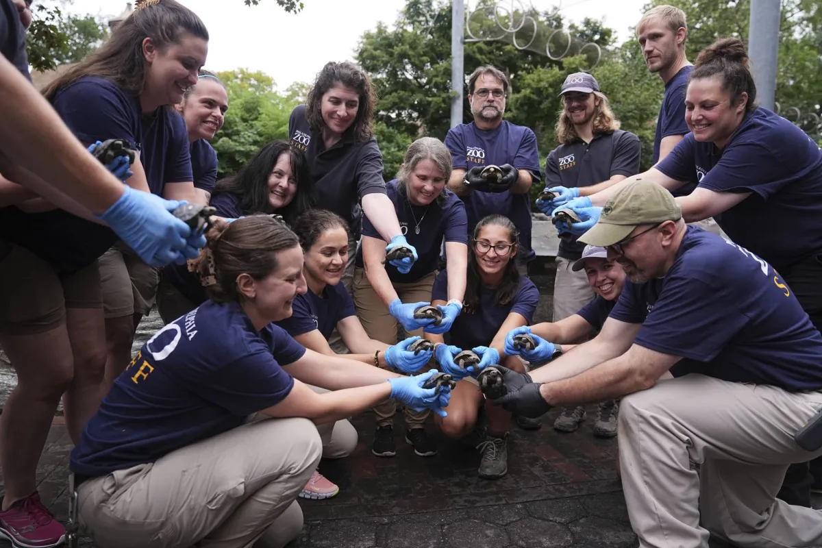 Animal care specialists who have watched over the 16 since they were eggs held the animals on a pathway by the zoo’s tortoise habitat. The hatchlings are said to be eating well and growing, The Associated Press reported.