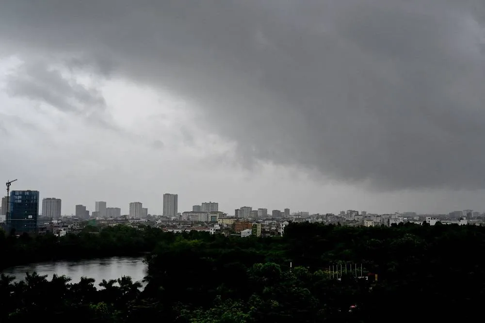 Storm clouds form above the buildings in Vinh city, Nghe An province on August 25, 2025, before Typhoon Kajiki makes landfall in Vietnam. (AFP)