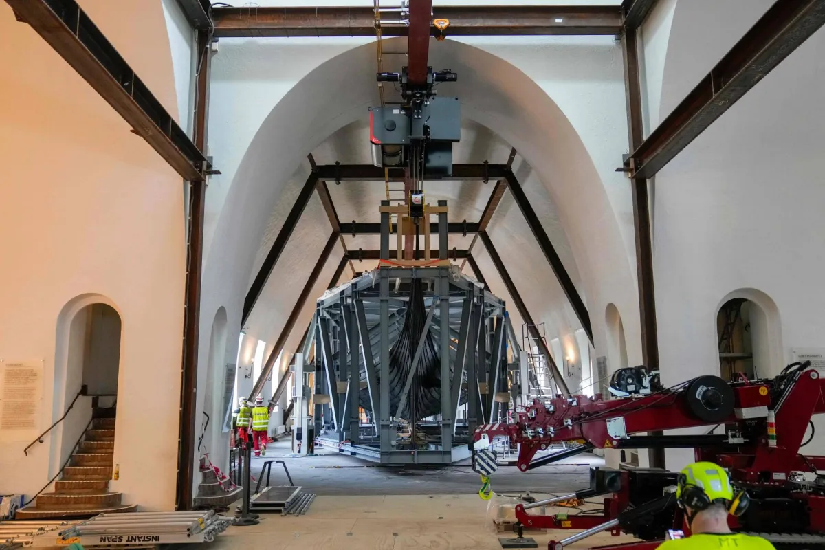 The extremely fragile oak hull, encased in a heavy protective steel rig, will make the hundred-meter journey over 10 hours, lifted by a crane moving on a track on the ceiling.