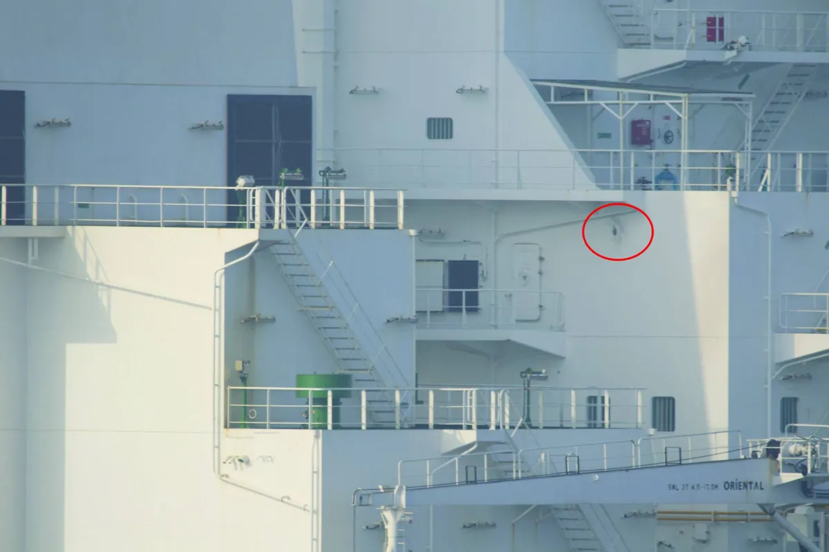 Damage sustained by M/T Richmond Voyager after personnel from an Iranian naval vessel fired multiple long bursts of rounds from small arms and crew-served weapons during an attempt to unlawfully seize the commercial tanker, according to US Navy, is seen, in the Gulf of Oman, in this handout photo provided by US Navy on July 5, 2023. US Naval Forces Central Command/US 5th Fleet/Handout via REUTERS