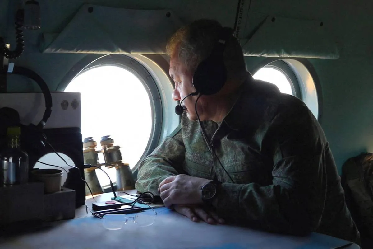 Russia's Defense Minister Sergei Shoigu looks through a helicopter window during his flight to remote Arctic garrisons of the Northern Fleet on the Novaya Zemlya archipelago, Russia, in this picture released August 12, 2023. (Russian Defense Ministry/Handout via Reuters)