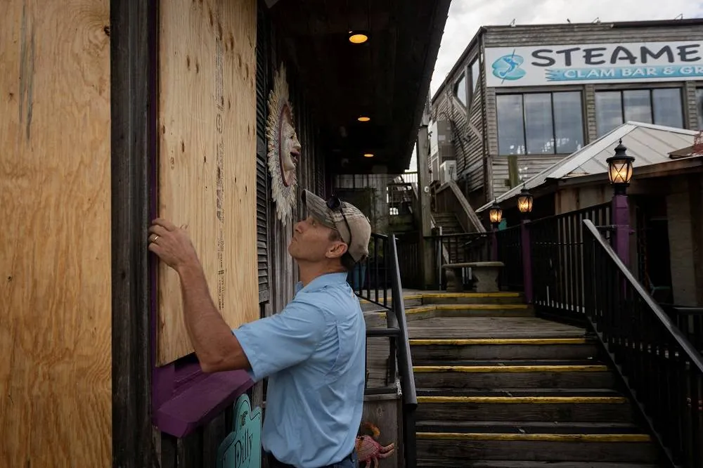A man places plywood in front of a store ahead of the arrival of Hurricane Idalia in Cedar Key, Florida, US, August 29, 2023. (Reuters)