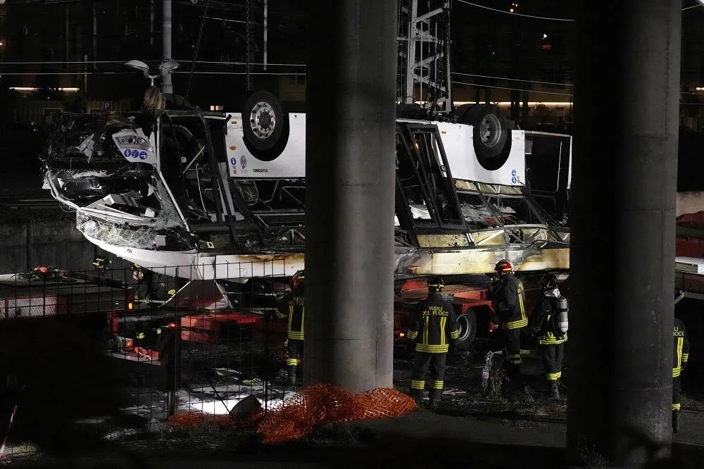 The electric bus, carrying foreign tourists returning from a day trip to Venice, crashed through the guardrail and off an overpass late on Tuesday in the Mestre district, slamming into the ground more than 10 meters (33 ft) below and catching fire.