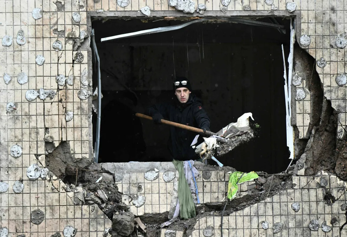 A local resident clears debris from an apartment at a heavily damaged residential building, three days after a Russian missile attack in Kyiv, on January 5, 2024, amid the Russian invasion of Ukraine. (Photo by Genya SAVILOV / AFP)