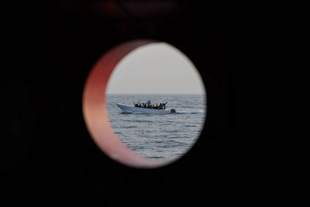Migrants sailing in international waters aboard a small wooden boat are seen from the Spanish NGO Open Arms rescue vessel, on January 18, 2024 off the Libyan coast, in international waters of the central Mediterranean. (AFP)