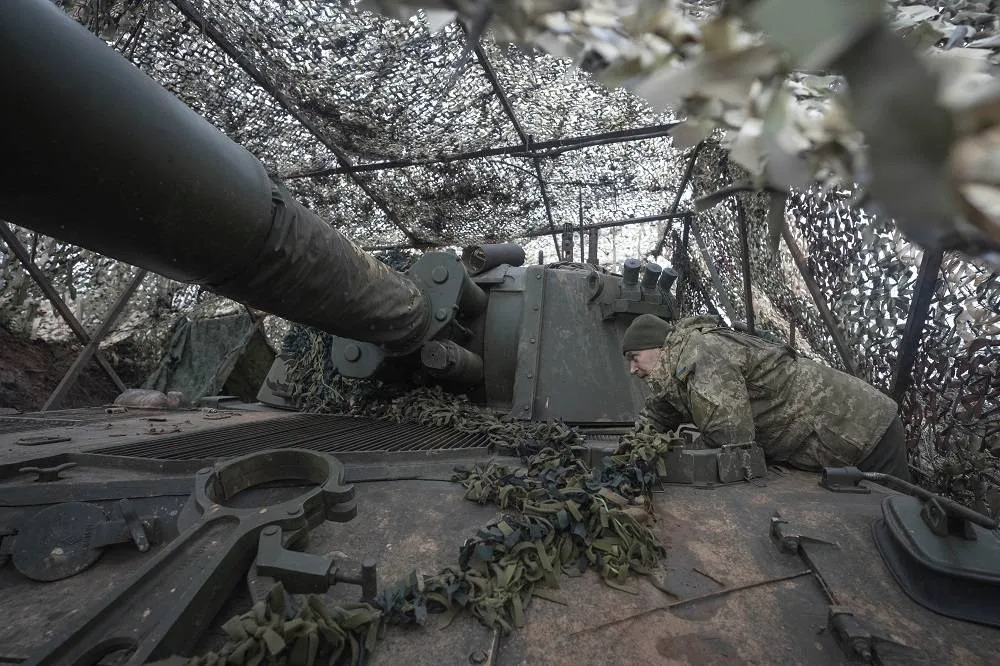 A soldier of the 12th Special Forces Brigade Azov of the National Guard prepares to fire a 155mm self-propelled gun M109 Paladin, towards Russian positions at the front line, near Kreminna, Luhansk region, Ukraine, Sunday, Jan. 28, 2024. (AP)