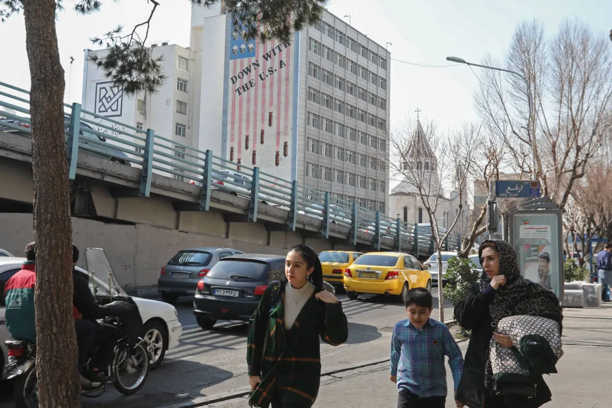 A family walks past an anti-US mural covering the wall of a building in the background in central Tehran on January 30, 2024. (Photo by ATTA KENARE / AFP)