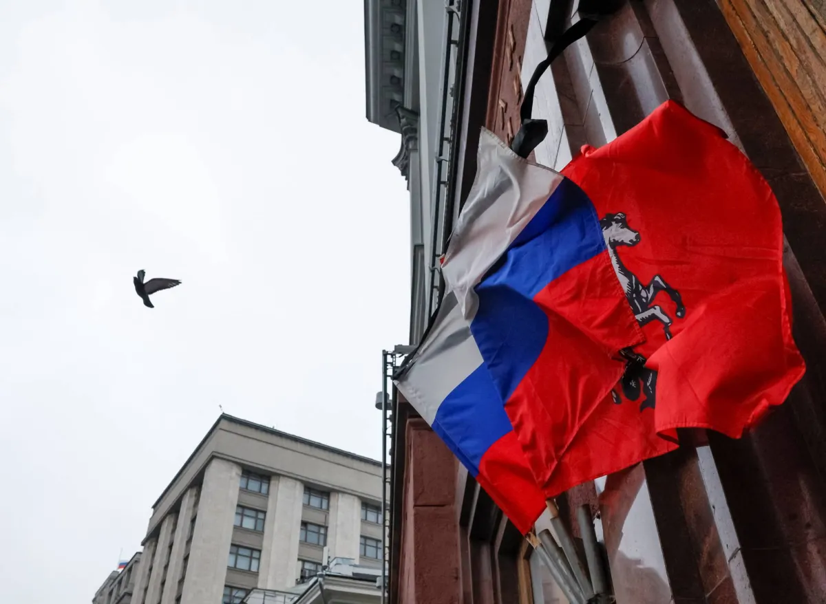 Russian national and Moscow city flags with attached black ribbons are seen on the day of mourning, declared following a deadly shooting in the Crocus City Hall concert hall, in Moscow, Russia March 24, 2024. REUTERS/Shamil Zhumatov