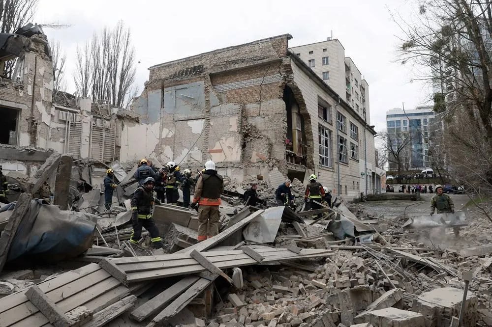 Rescuers work at the site of a building damaged by a Russian missile strike, amid Russia's attack on Ukraine, in Kyiv, Ukraine March 25, 2024. (Reuters)