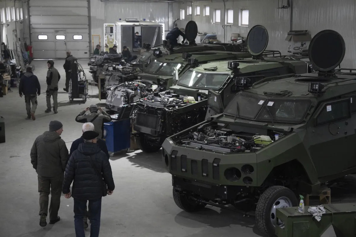 Armored vehicles are worked on at a factory in Ukraine, on Friday, December 22, 2023. (AP Photo/Evgeniy Maloletka)