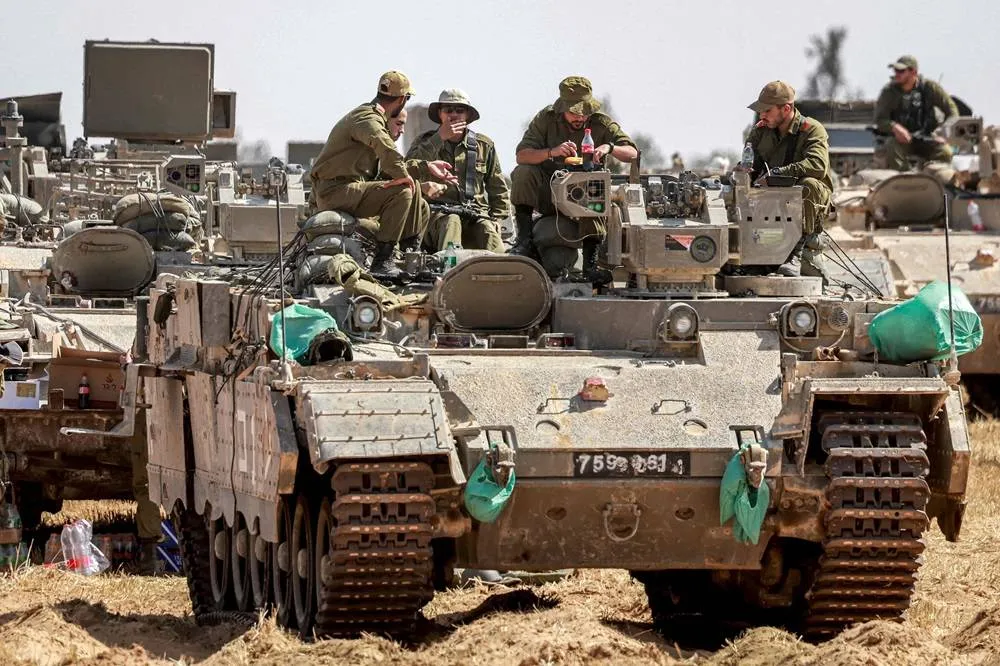 Israeli army soldiers sit atop an infantry-fighting vehicle (IFV) stationed at a position near the border with the Gaza strip in southern Israel on April 30, 2024, amid the ongoing conflict in the Palestinian territory between Israel and the group Hamas. (AFP)