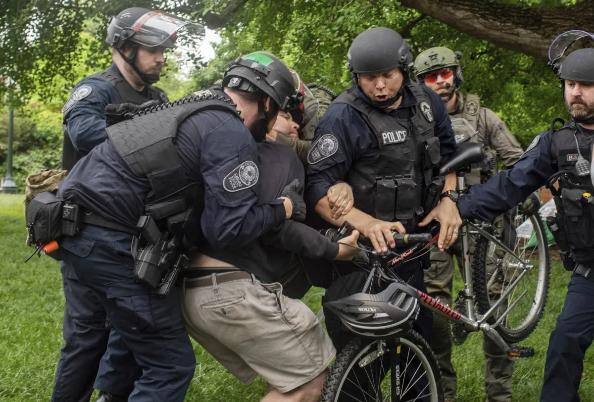 Police grab a protester with his bicycle on the campus of the University of Virginia, in Charlottesville, Va., where tents are set up, Saturday, May 4, 2024. (Cal Cary/The Daily Progress via AP)