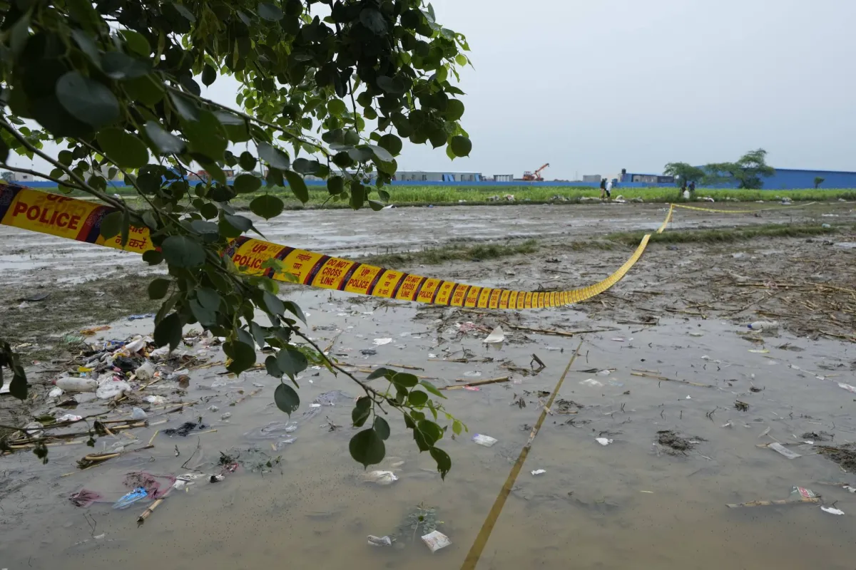 Police tape cordons off the scene a day after a fatal stampede, in Fulrai village of Hathras district, India, Wednesday, July 3, 2024. (AP Photo/Rajesh Kumar Singh)