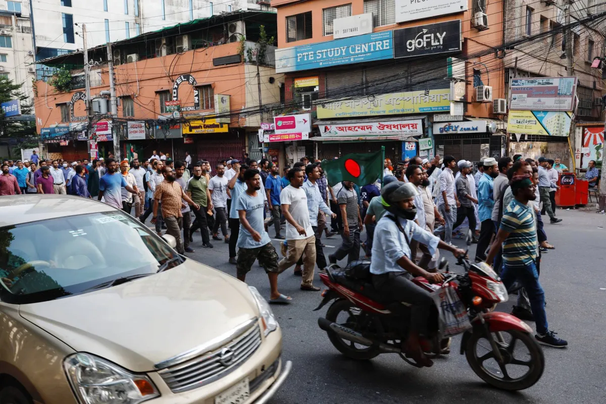 Protesters march on the street of Dhanmondi in front of Bangabandhu Sheikh Mujibur Rahman Memorial Museum in Dhaka, Bangladesh, August 15, 2024. REUTERS/Mohammad Ponir Hossain