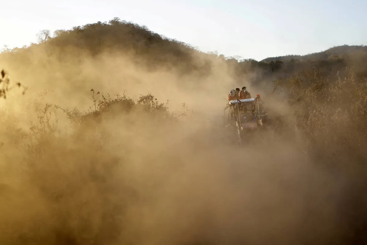FILE PHOTO: Volunteer firefighter members of the Alto Pantanal Brigade are seen on a tractor as they work to extinguish a fire rising in the Pantanal, the world's largest wetland, in Corumba, Mato Grosso do Sul state, Brazil, June 14, 2024. REUTERS/Ueslei Marcelino/File Photo