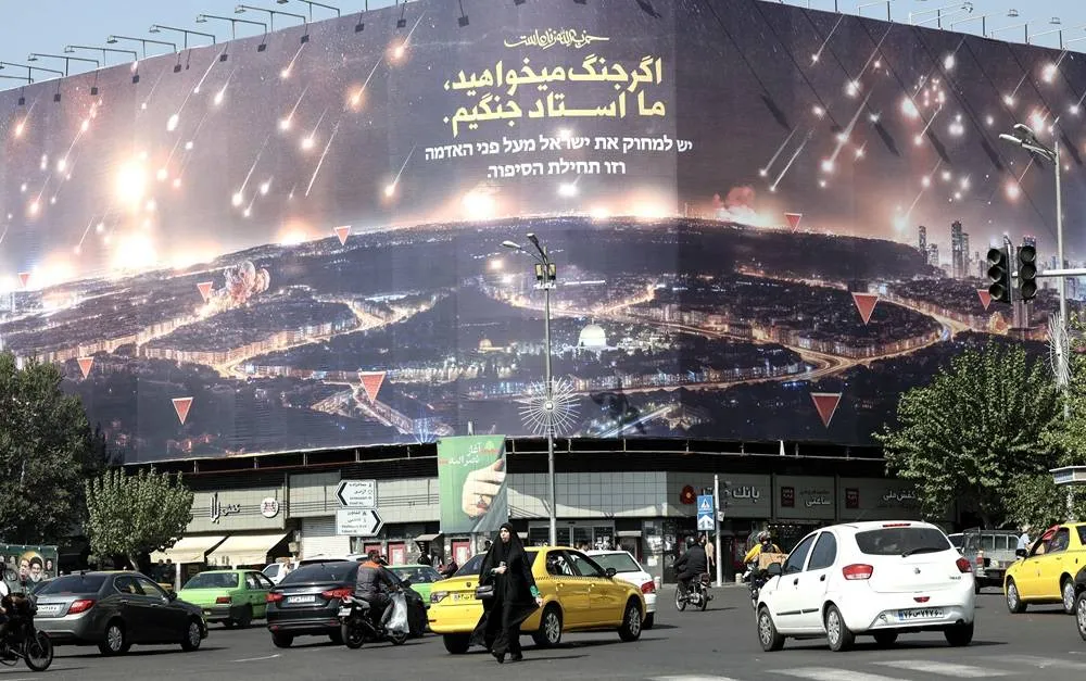 People pass by an anti-Israel billboard depicting Iran's missile attack on Israel with a sentence reading in Persian “If you want war, we are the master of war”, at the Enqelab Square, in Tehran, Iran, 07 October 2024. (EPA)