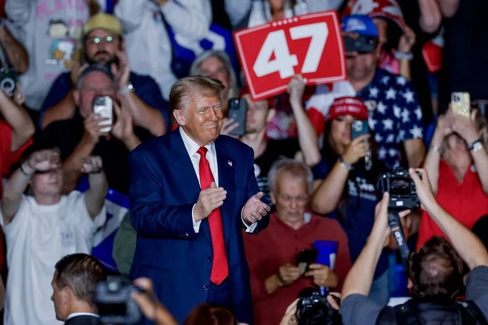 Former US president and Republican presidential nominee Donald Trump reacts at the conclusion of a campaign rally at the Greensboro Coliseum in Greensboro, North Carolina, USA, 22 October 2024. (EPA)