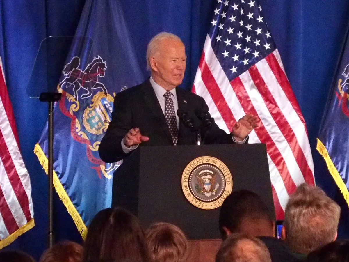 01 November 2024, US, Philadelphia: US President Joe Biden delivers a speech at the UA Local 692 Sprinkler Fitters Union in Philadelphia. Photo: Bruce Cotler/ZUMA Press Wire/dpa