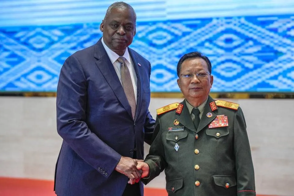 Laos' Defense Minister Chansamone Chanyalath, right, welcomes US Defense Secretary Lloyd Austin during the Association of Southeast Asian Nations (ASEAN) defense ministers' meeting in Vientiane, Laos, Thursday, Nov. 21, 2024. (AP Photo/Anupam Nath)