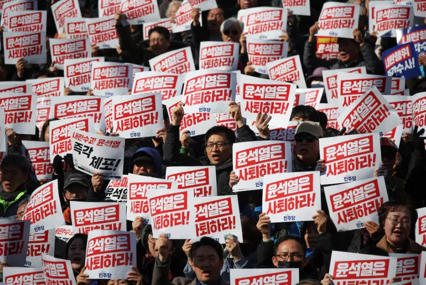 Protesters hold up signs that read "Step down President Yoon Suk Yeol" as people and lawmakers attend a rally in Seoul. REUTERS/Kim Hong-Ji