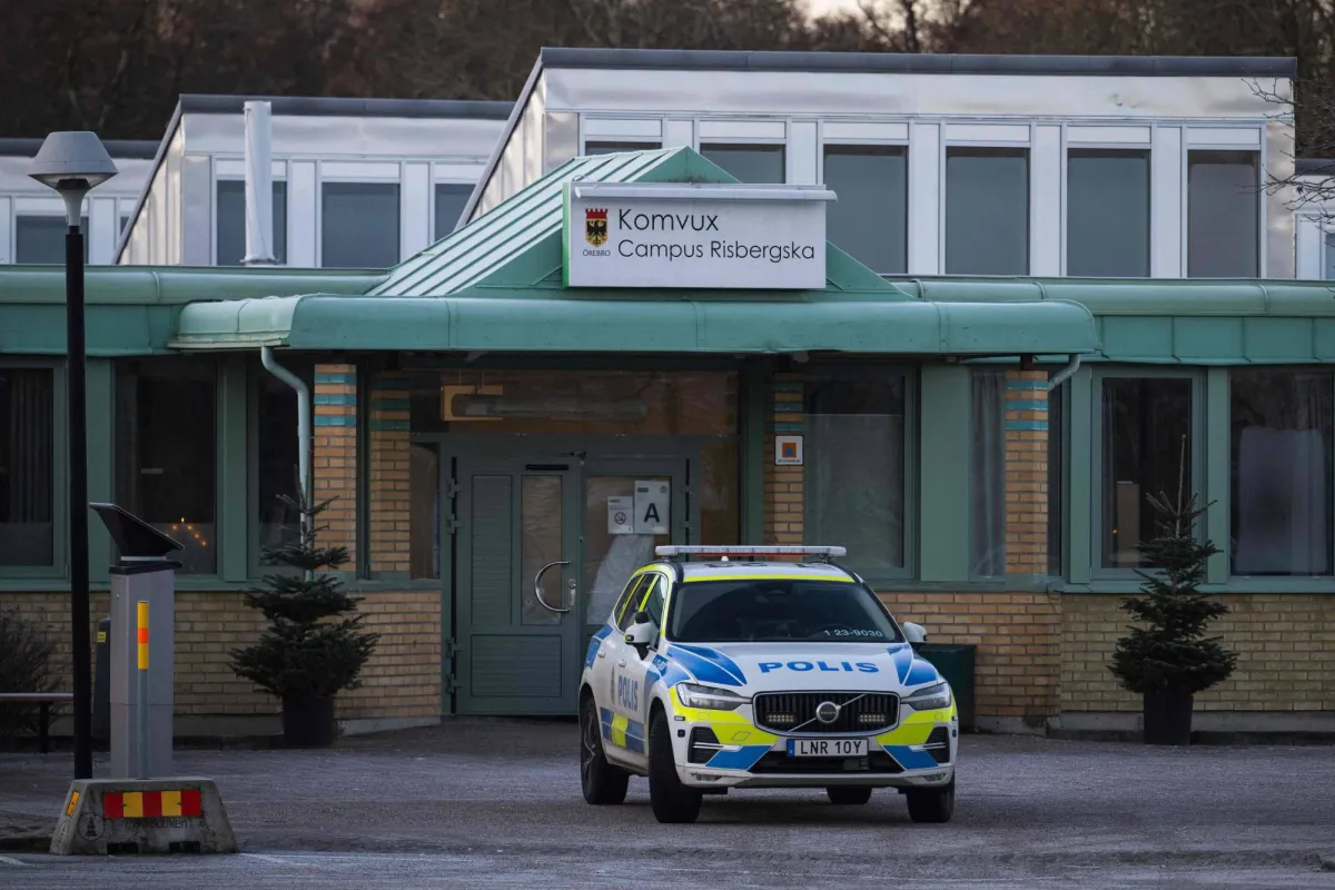 Police officers stand guard outside the adult education center Campus Risbergska school in Orebro, Sweden, on February 6, 2025 two days after a shooting there left eleven people dead. (Photo by Jonathan NACKSTRAND / AFP)