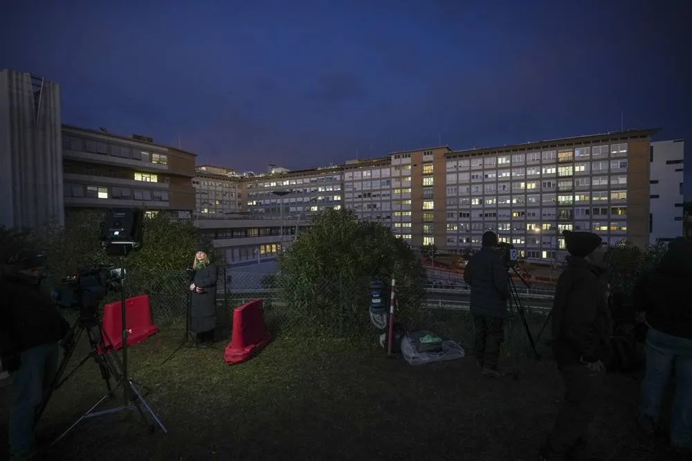 Journalists wait outside the Agostino Gemelli Polyclinic in Rome, Saturday, Feb. 15, 2025, where Pope Francis was hospitalized Friday after a weeklong bout of bronchitis worsened and is receiving drug therapy for a respiratory tract infection. (AP)