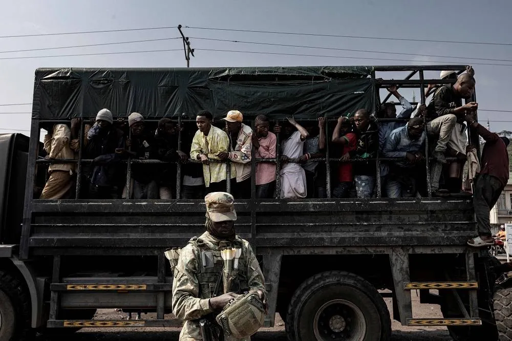 A member of the M23 movement stands guard as people board a truck during an enrollment of civilians, police officers, and former members of the Armed Forces of the Democratic Republic of Congo (FARDC) who allegedly decided to join the M23 movement voluntarily in Goma on February 23, 2025. (AFP)