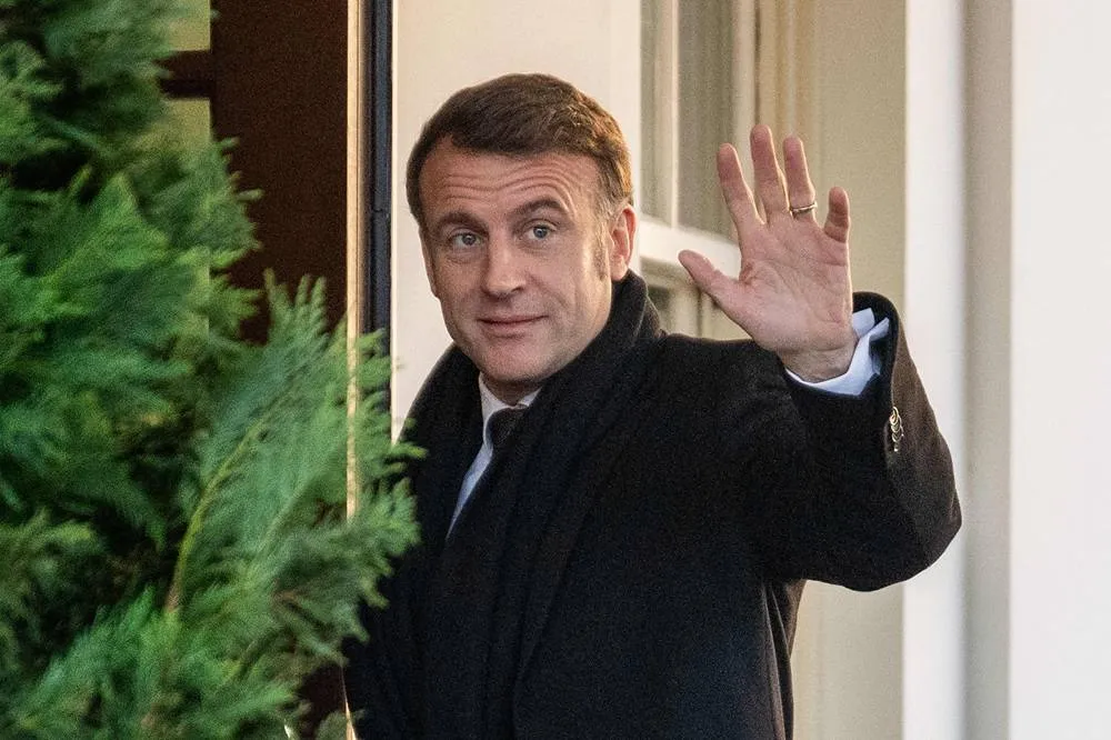 French President Emmanuel Macron waves to the press as he arrives at the White House in Washington, DC, on February 24, 2025. (AFP)