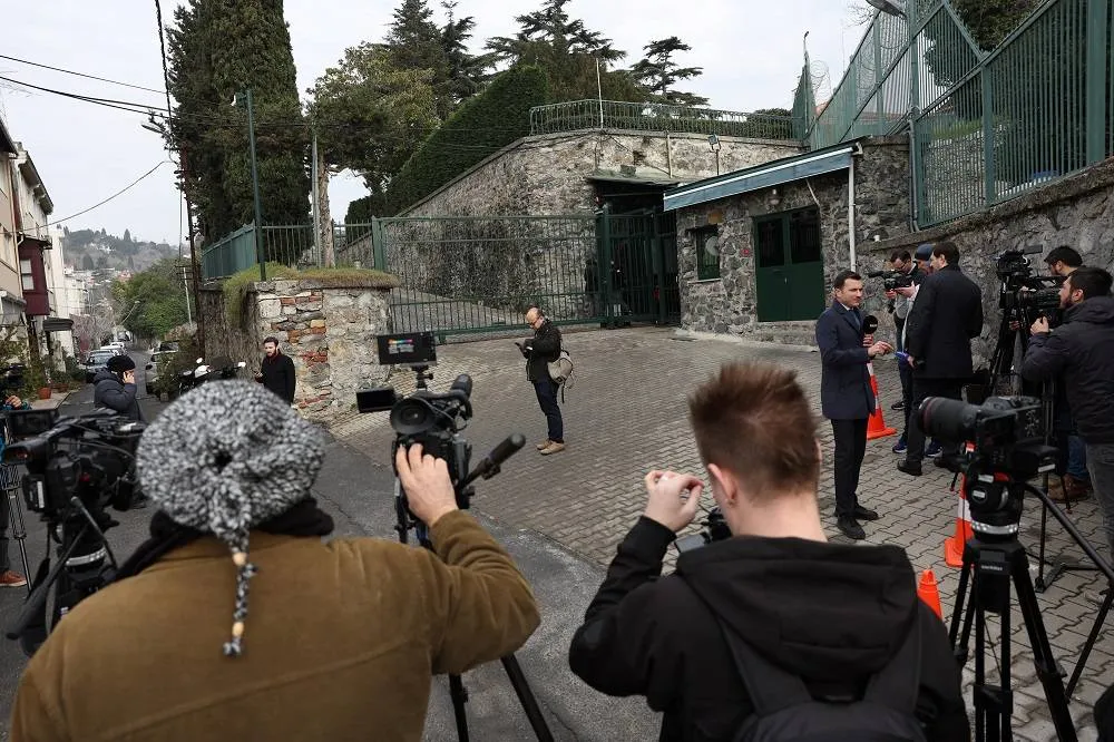 Members of the media wait outside the residence of the US Consul General during a meeting between US and Russian delegations in Istanbul, Türkiye, February 27, 2025. (Reuters)