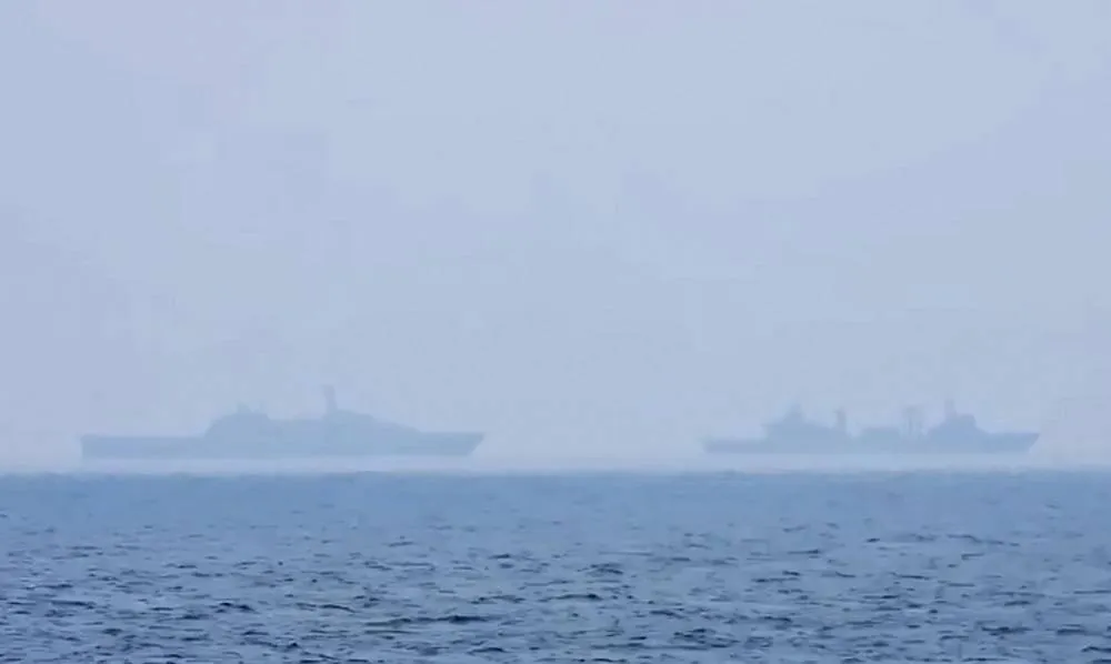 This image taken off a video released by the Taiwan Ministry of National Defense shows what it says Chinese war ships conducting drills about 40 nautical miles (74km) off the coast of western Taiwan's Kaohsiung and Pingtung cities on Wednesday, Feb. 26, 2025. (Taiwan Ministry of National Defense via AP)