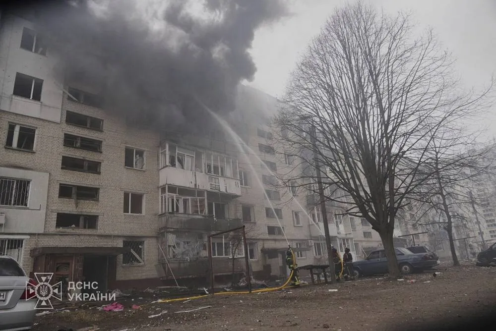 In this photo provided by the Ukrainian Emergency Service, firefighters put out the fire following a Russian attack in Sumy, Ukraine, Tuesday, March 25, 2025. (Ukrainian Emergency Service via AP)