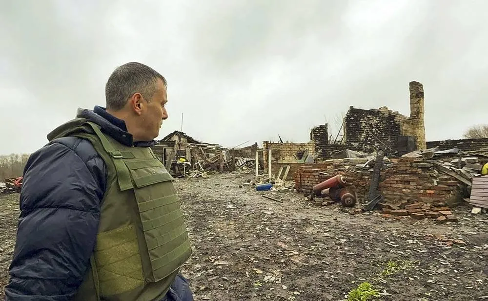 A handout photo made available by the acting Governor of the Kursk region Alexander Khinshtein shows the governor during his visit to Pogrebki, Kursk region, Russia, 07 April 2025. (EPA/Alexander Khinshtein/Handout)