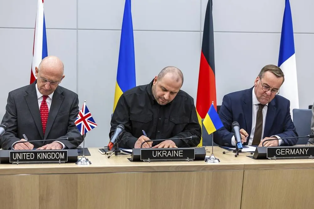 Britain's Defense Secretary John Healey, left, Ukraine's Defense Minister Rustem Umerov, center and Germany's Defense Minister Boris Pistorius signing the letter of intent for a capability coalition for electro-magnetic warfare during a meeting of the Ukraine Defense Contact Group at NATO headquarters in Brussels, Friday, April 11, 2025. (AP)