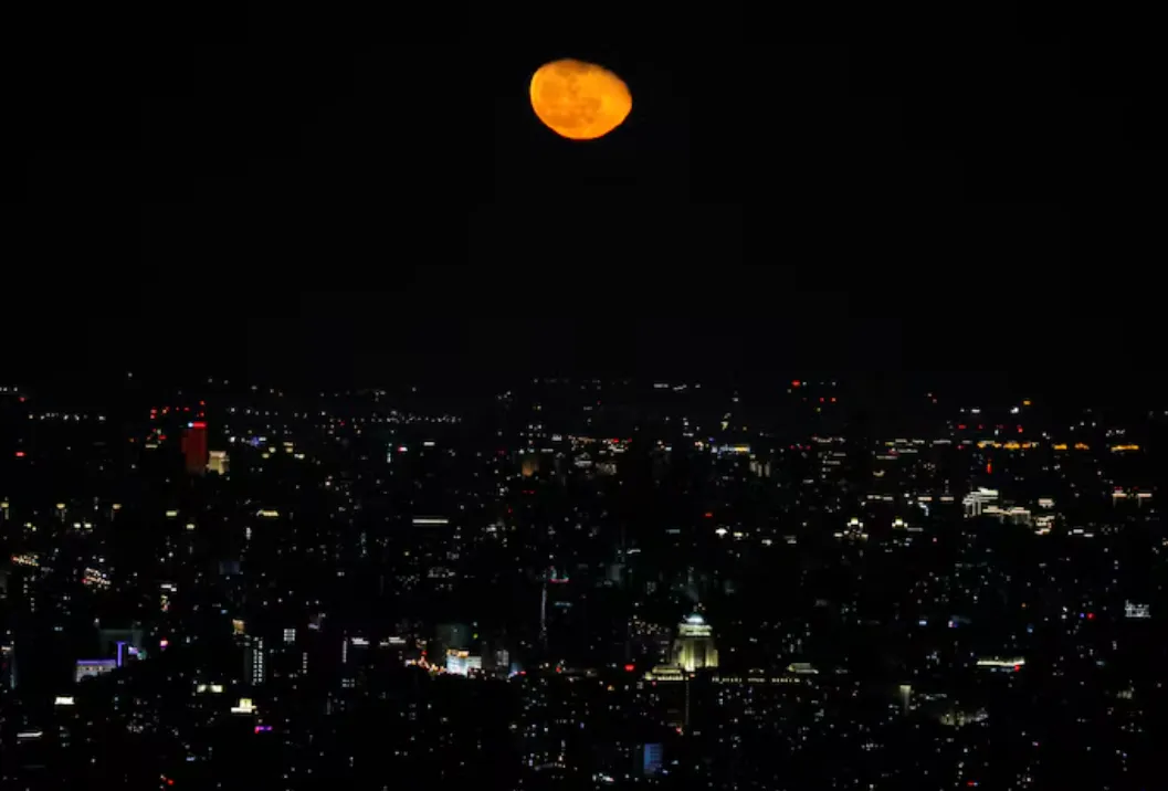 The moon is seen over the city of Beijing, China, February 20, 2022. REUTERS/Tingshu Wang/File Photo