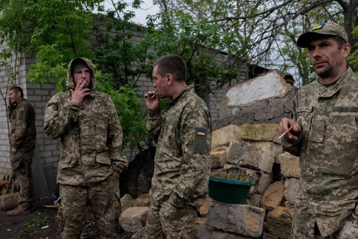 Ukrainian servicemen of the 24th Separate Assault Battalion "Aidar" smoke during a rest moment between rotations at an undisclosed location in Dnipropetrovsk Region on May 9, 2025, amid the Russian invasion of Ukraine. (Photo by Tetiana DZHAFAROVA / AFP)