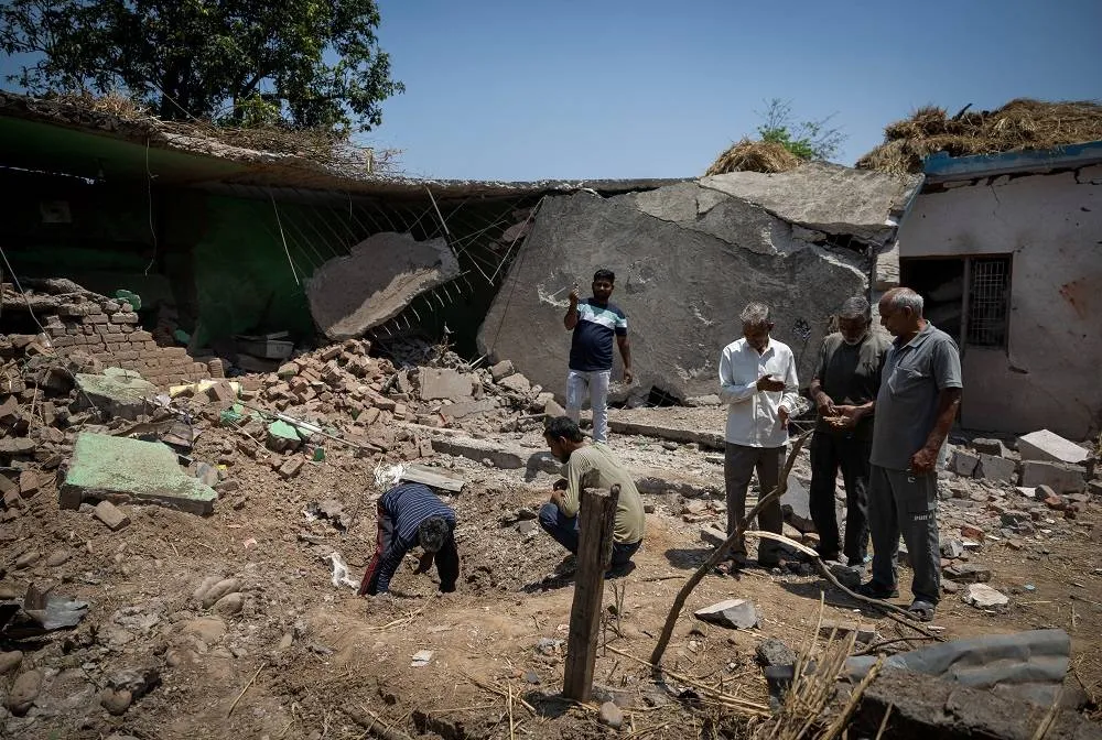 Villagers look for the fragments in a crater outside a house damaged by a cross-border shelling last week at Kot Maira, a border village in Jammu region, May 12, 2025. (Reuters)