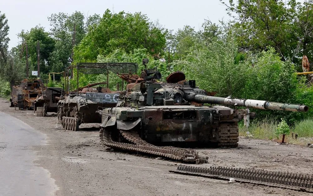 A view shows an abandoned column of armored vehicles, which was destroyed in the course of Russia-Ukraine conflict in the village of Mykilske (Nikolskoye) near Vuhledar (Ugledar) city in the Donetsk region, a Russian-controlled area of Ukraine, May 27, 2025. (Reuters)