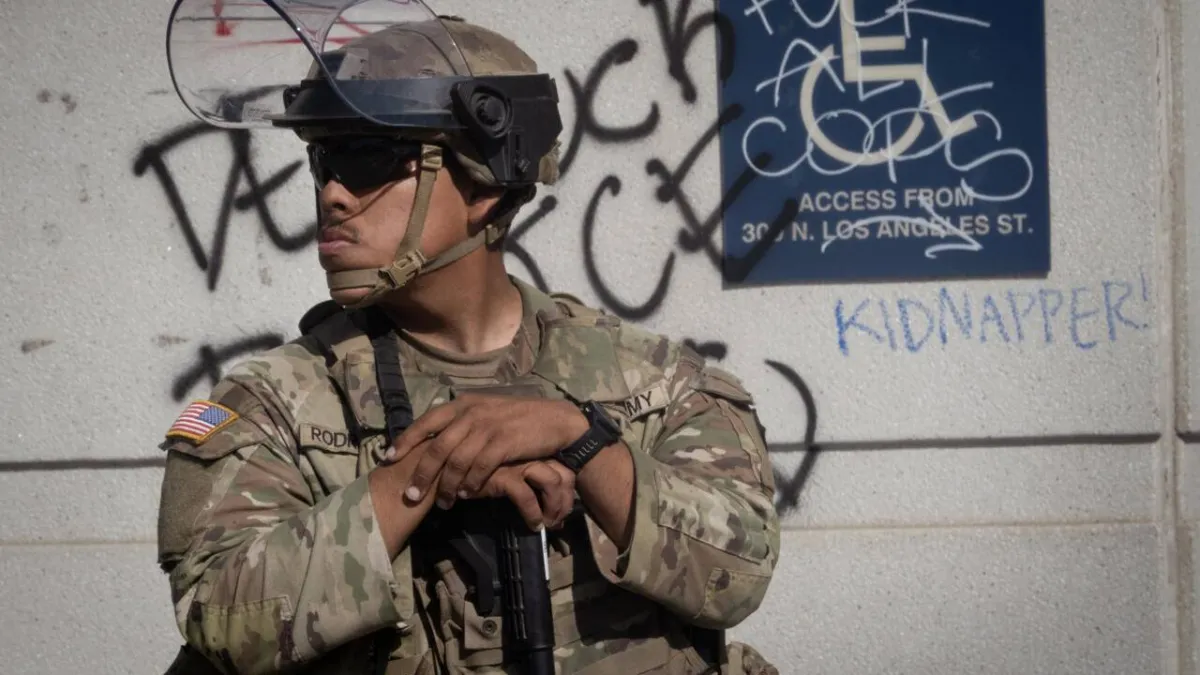 A California National Guard soldier stands guard outside of the federal building complex in downtown Los Angeles, California. SCOTT OLSON / GETTY IMAGES NORTH AMERICA/AFP