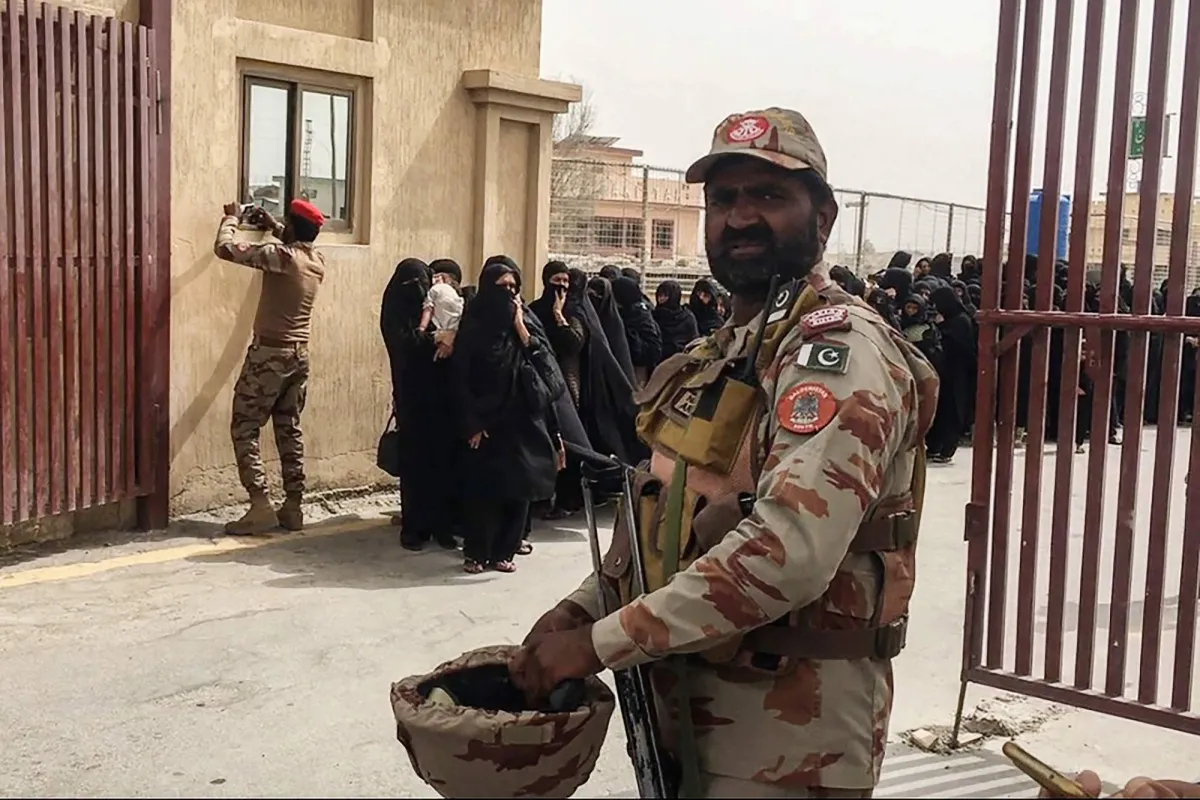 Pakistani security personnel stand guard as pilgrims (back) who evacuated from Iran walk at the Pakistan-Iran border in Taftan on June 16, 2025. (Photo by AFP)