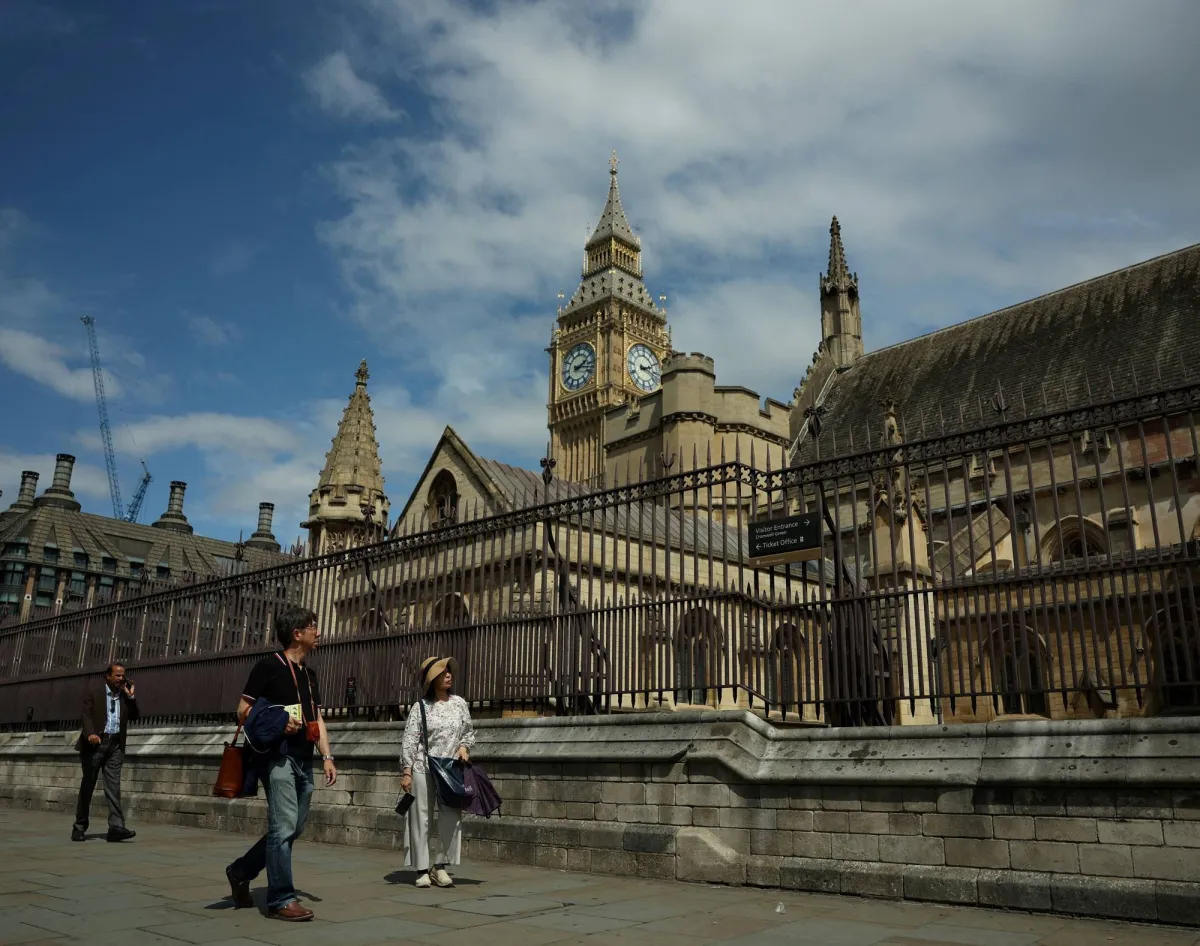 Tourists walk past the Elizabeth Tower, commonly known as Big Ben, and the Houses of Parliament, in London, Britain, June 26, 2025. REUTERS/Isabel Infantes