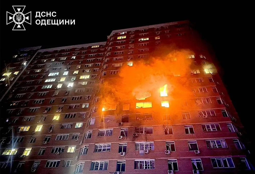 This handout picture taken and released by Ukrainian State Emergency Service on June 28, 2025 shows a fire in a multi-storey residential building following a Russian drones attack in Odesa, amid Russian invasion in Ukraine. (Handout / Ukrainian State Emergency Service / AFP)