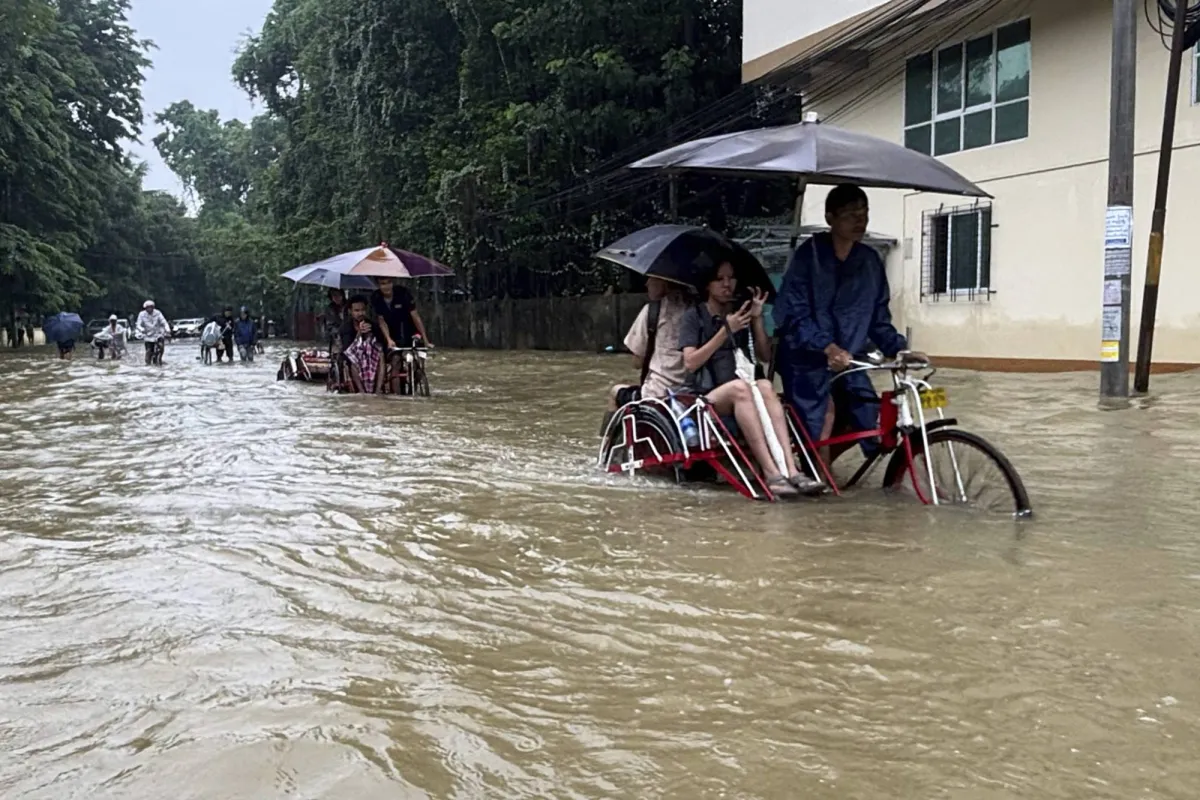Trishaw men carrying passengers drive through a road flooded due to heavy rain Saturday, June 21, 2025, in Yangon, Myanmar. (AP Photo/Thein Zaw)