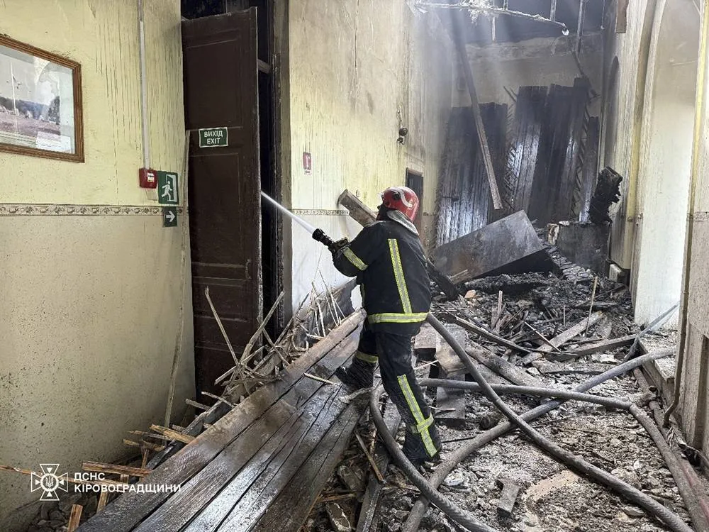 In this photo provided by the Ukrainian Emergency Service, firefighters put out the fire in a fire department school following a Russian air attack in Kropyvnytskyi, Ukraine, Monday, July 28, 2025. (Ukrainian Emergency Service via AP)