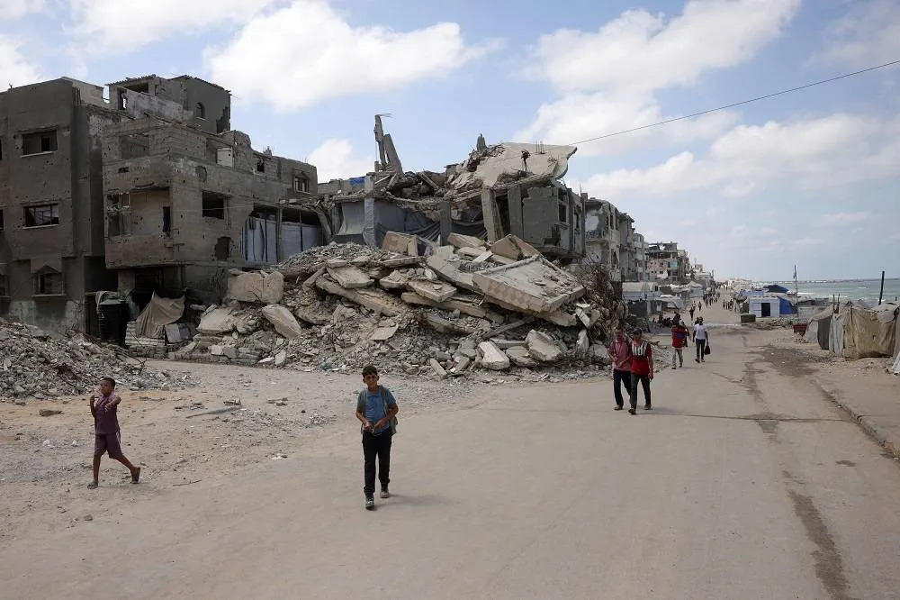 Palestinians walk along a street near war-damaged buildings along the shore in Gaza City on August 8, 2025. (AFP)