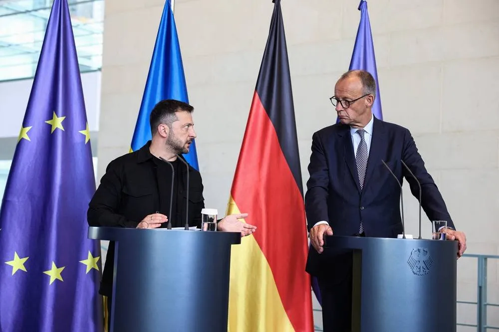 German Chancellor Friedrich Merz and Ukrainian President Volodymyr Zelenskyy attend a press conference, on the day they attend a virtual meeting with US President Donald Trump and European leaders on the upcoming Trump-Putin summit on Ukraine, in Berlin, Germany, August 13, 2025. (Reuters)
