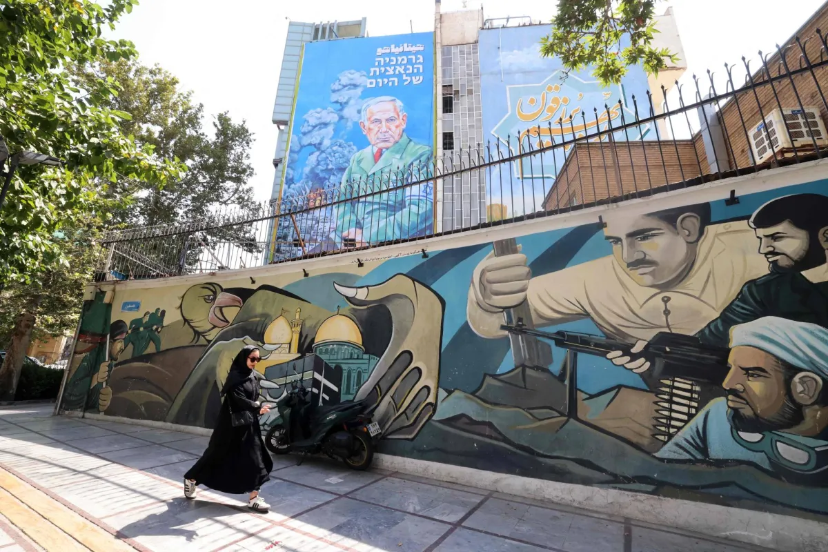 An Iranian woman walks on a sidewalk next to a recently unveiled billboard bearing the portrait of Israel's Prime Minister Benjamin Netanyahu with text in Persian reading "Hitanyahu" and text in Hebrew reading "Germany's Nazi of today" at Palestine Square in central Tehran on August 11, 2025. (Photo by ATTA KENARE / AFP)