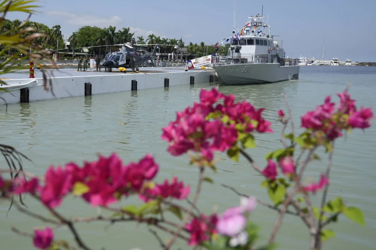 FILE - Navy men stand beside an AW109E helicopter and BRP Laurence Narag ship as they are displayed during the 126th Philippine Navy anniversary in Manila, Philippines on Friday, May 24, 2024. (AP Photo/Aaron Favila, file)