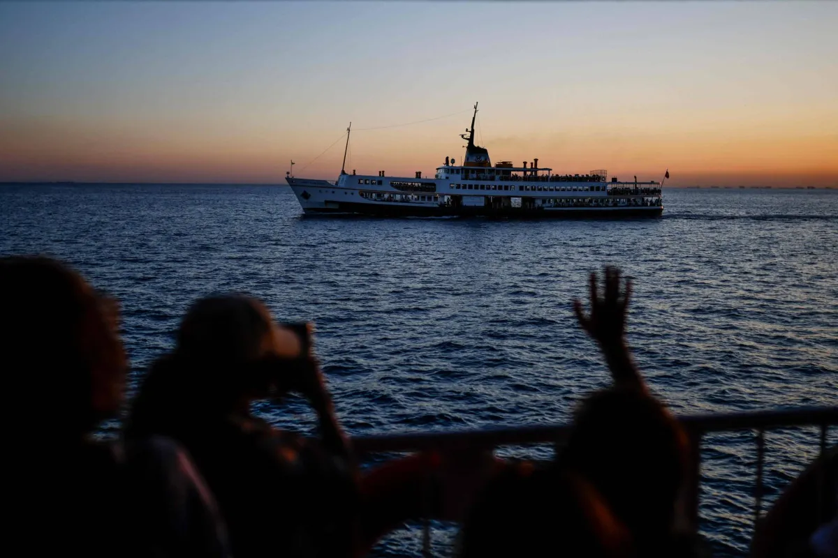 Passengers wave at anothger boat as they sail aboard the Pasabahce ferryboat to Princes islands in Istanbul, on August 21, 2025. (Photo by KEMAL ASLAN / AFP)