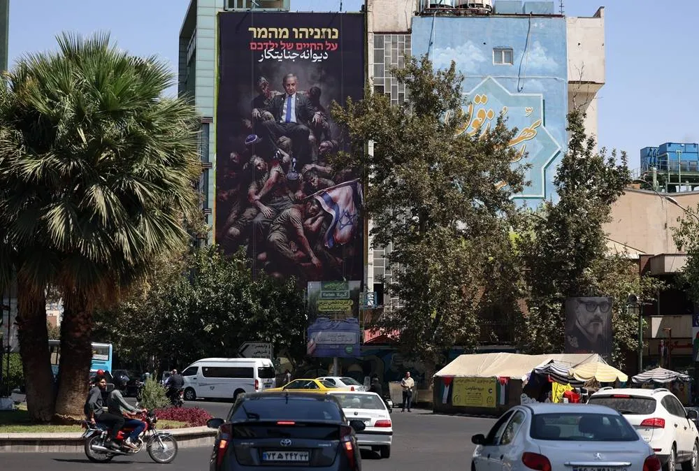 Iranians drive past a huge anti-Israeli billboard displaying a picture of Israeli Prime Minister Benjamin Netanyahu and sentences reading in Hebrew, “Netanyahu is gambling on the lives of your children,” and in Persian, “Mad criminal,” at the Palestine Square in Tehran, Iran, 03 September 2025. (EPA)